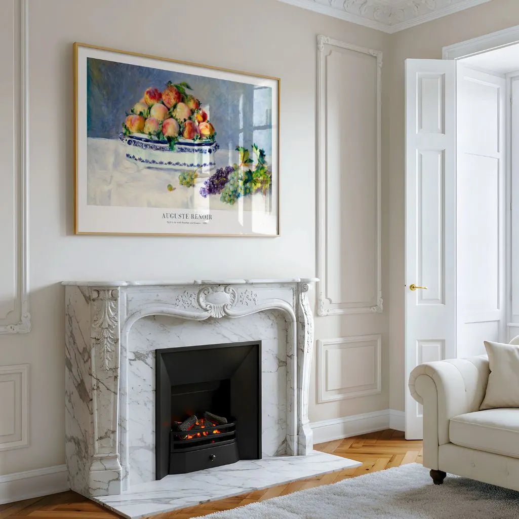 Add a soft, refined accent to your home with this horizontal-format Auguste Renoir Still Life with Peaches and Grapes poster. A bowl of ripe fruit is painted with gentle impressionist brushwork and a pastel backdrop, creating elegant wall art that feels warm, sensual, and quietly luxurious.