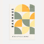 This Bauhaus-style poster offers an elegant modernist look in soft pastel tones of yellow, gray, and beige. Geometric semicircles and squares align in a calm, balanced rhythm, creating wall art that feels light, harmonious, and quietly distinctive. The gentle palette keeps the design refined while still adding structure and visual interest.