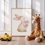 Bunny with Flowers Poster is charming kids wall art in a gentle watercolor style, featuring a sweet bunny holding pink flowers. Pastel tones, delicate brushwork, and a minimalist background create a calm, cosy mood that brings warmth to a child’s space without overwhelming the decor. The soft palette makes it easy to style in boho, Scandinavian, and classic interiors.