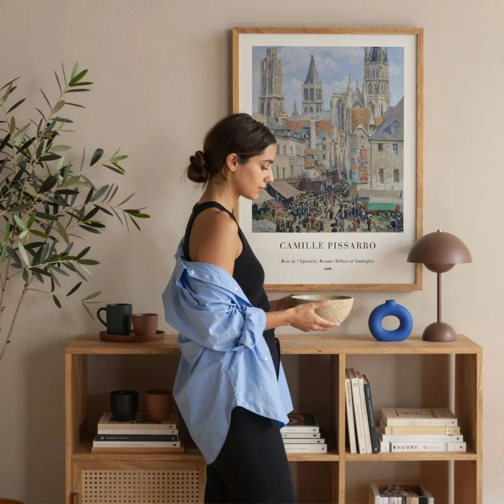 Camille Pissarro’s Rue de l’Épicerie, Rouen (Effect of Sunlight) captures the lively rhythm of a late-19th-century French city in shimmering, impressionist light. Soft brushwork, delicate tonal shifts, and flickering reflections create a sense of movement and atmosphere that feels fresh and timeless. This wall art brings airy elegance to a living room, office, or any space where you love the balance of art and natural light. Choose it as a framed poster or an unframed print to elevate both classic and modern interiors with effortless sophistication.