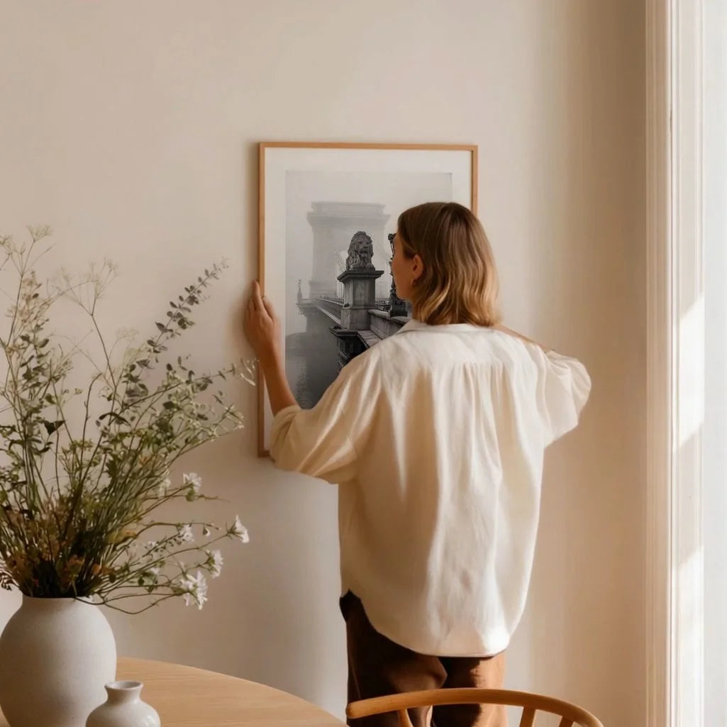 This refined wall art captures Budapest’s iconic Chain Bridge emerging from dense fog in a striking black and white composition. Monumental lion sculptures, historic architecture, and soft diffused light create a calm yet dramatic mood rooted in urban photography and minimalist aesthetics.