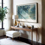 Delicate blues, muted greens, and silvery greys blend in gentle brushstrokes, with tree branches leaning into the scene and reflections shimmering below. The wide composition enhances the sense of open air and stillness, making it an ideal piece for modern, minimalist interiors, living rooms, offices, and relaxation spaces. Display it as a framed poster for a refined focal point, or choose an unframed print for a lighter, airy look.