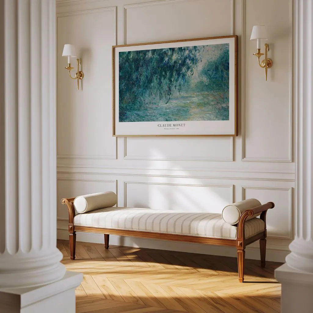 This Claude Monet poster features Morning on the Seine (1898) in a panoramic format, capturing the hush of daybreak with subtle, luminous atmosphere. Soft mist hovers above the river as light glides across the water, creating wall art that feels calm, spacious, and quietly restorative—an impressionist moment defined by mood rather than detail.