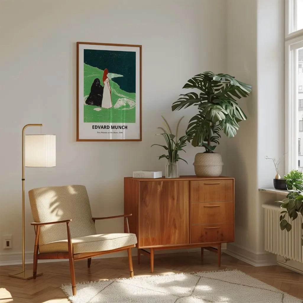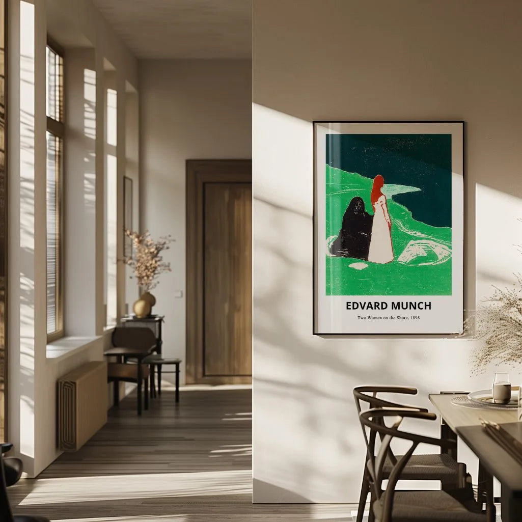 This Edvard Munch poster features Two Women on the Shore (1898), a hauntingly poetic work where symbolism and emotion meet. Two figures stand by the water in a scene often read as a contrast of life and death, light and shadow—an intimate moment filled with tension, stillness, and introspection. The expressive forms and mood make this wall art a powerful statement for anyone drawn to symbolist and early expressionist art.