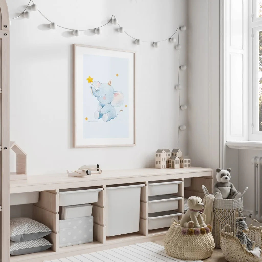 This delicate wall art features a watercolor baby elephant holding a star wand, set in a soothing pastel blue palette with tiny scattered stars. The minimalist illustration creates a calm, storybook atmosphere that feels gentle and timeless in a nursery or child’s room.