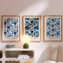 This set of three Flower Garden botanical prints features hand-painted watercolor florals inspired by classic botanical illustrations and decorative floral patterns. Each artwork showcases expressive blue flowers and delicate foliage arranged in a repeating, balanced composition.