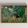 Step into a lush, dreamlike world with this framed canvas print of Henri Rousseau’s “Equatorial Jungle” in a horizontal format. Dense tropical leaves, towering palms, and exotic flowers create an immersive scene where hidden animals and watchful eyes seem to appear from the greenery. Rousseau’s precise, naïve style gives the painting its signature atmosphere—calm and enchanting, yet subtly mysterious.