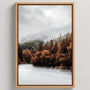 Invite stillness into your home with the framed canvas print “Forest Silence.” This subtle photography artwork captures treetops in golden-rust tones wrapped in soft mist, creating a landscape filled with calm and quiet emotion. Light filters through the haze, gently blurring the line between land, water, and sky—giving the scene a painterly, atmospheric softness.