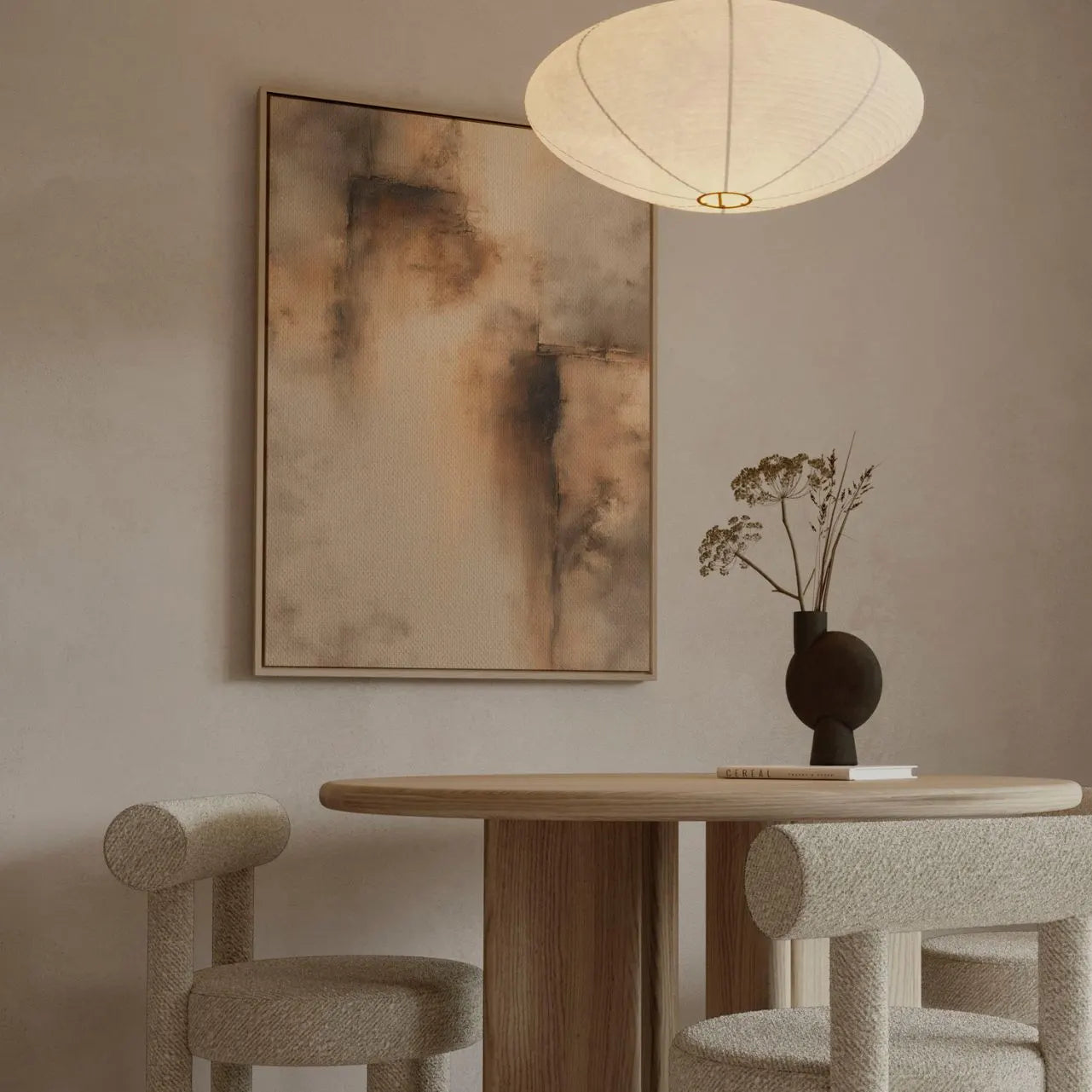 Bring a warm, sunlit stillness into your home with the framed canvas print Golden Trace. This subtle yet expressive abstract blends beige, brown, and soft grey tones into a balanced composition inspired by nature—stone, texture, and early-morning light. Gentle gradients meet quiet structure, evoking the feeling of a wall brushed by sunlight, with a hint of glow and calm. Printed on premium textured fabric for a painterly effect, this framed canvas print is ready to hang and adds understated elegance without visual noise. Perfect for modern organic, japandi, boho natural, and scandi interiors, it becomes a timeless focal point for a living room, bedroom, or serene workspace.