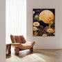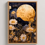 This framed canvas print captures the quiet magic of a Japanese-inspired moon garden, where a golden full moon softens the night and illuminates delicate flowers. Deep navy and black tones create a hypnotic backdrop, while creamy gold blossoms—reminiscent of daisies—float in gentle light, bringing a refined decorative contrast.