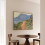 Bring the warmth of the French Riviera into your space with this framed canvas print of Claude Monet’s La Corniche near Monaco (1884). Painted during his journey through southern France, the scene captures Mediterranean light in motion—rocky coastline, shimmering blues of the sea, and soft pastel tones across sky and vegetation. The composition guides the eye along a sandy path that winds through hillside greenery toward distant, sunlit slopes.