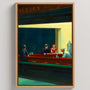 This framed canvas print features Nighthawks by Edward Hopper, one of the most iconic images of urban solitude in modern art. The illuminated corner bar contrasts sharply with the dark, empty streets, creating a cinematic scene filled with silence, distance, and unspoken emotion.