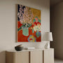 Bring vibrant, decorative energy into your space with this framed canvas print of Henri Matisse’s Plum Blossoms (1948). The composition features a lush bouquet arranged on a red table, surrounded by vessels and fruit, with a simplified figure shape in the background. Matisse’s late style shines through in confident blocks of color and reduced forms, creating a modern rhythm that feels both playful and beautifully composed.