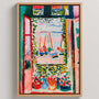 Add a bold burst of color to your space with this framed canvas print of Henri Matisse’s The Open Window (1905). An open, brightly painted window frame becomes a gateway to light, sea air, and a sunlit view—flowers, boats, and sky rendered with playful energy. Matisse’s early Fauvist palette brings vivid pinks, turquoise, reds, and greens together in a way that feels spontaneous and uplifting, using color to express emotion rather than realism.