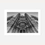 Make a bold, elegant statement with this black and white wall art print featuring the imposing facade of a Gothic cathedral, captured from a low-angle perspective. The upward viewpoint emphasises height, symmetry, and intricate architectural detail, creating a noir-inspired mood with real depth and presence.