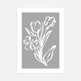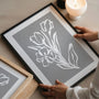 This minimalist floral wall art features a white hand-sketched flower illustration set against a soft grey background. The clean line work and restrained palette create a harmonious, modern composition with a subtle geometric rhythm—refined, calm, and easy to style.