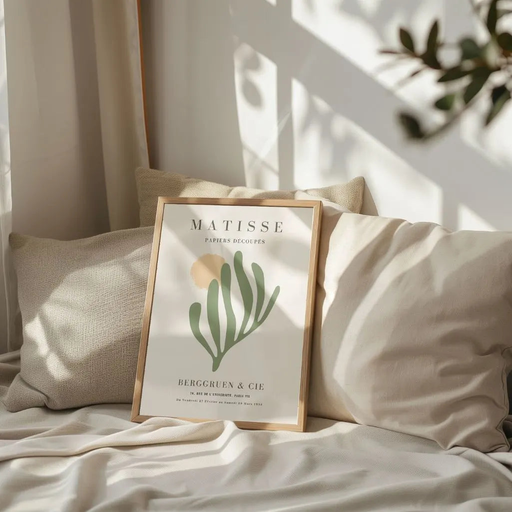 Inspired by Henri Matisse’s iconic Papiers Découpés, this elegant Poster brings calm, organic abstraction into your home. Soft shapes and a soothing palette of green and beige create a feeling of harmony, quiet balance, and natural beauty—perfect for everyday spaces that value simplicity.