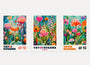 This set of three Japanese-inspired floral art prints presents expressive botanical compositions filled with movement, color, and layered organic detail. Flowing flower forms, delicate stems, and painterly textures create a harmonious visual rhythm inspired by traditional Japanese aesthetics and contemporary illustration.