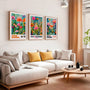 A vibrant yet balanced color palette of coral, pink, orange, teal, turquoise, soft green, and warm yellow brings a sense of freshness and joy. The compositions feel light and dynamic while maintaining visual calm, making the set suitable for both statement walls and serene interiors.