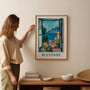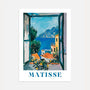This Henri Matisse–inspired poster, Okno na Amalfi (Window to Amalfi), brings the feeling of an Italian summer into your home. The view from an open window—turquoise sea, mountains, and the charming Amalfi town—creates a scene filled with light, color, and uplifting energy. Expressive brush-like strokes and a bold palette echo the playful, free-spirited character often associated with Matisse.