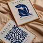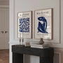 This set of two wall art prints is inspired by Henri Matisse’s iconic paper cut-outs, featuring abstract organic shapes in a rich, deep blue. The bold colour and flowing forms create compositions that feel dynamic yet balanced—modern, expressive, and effortlessly refined.