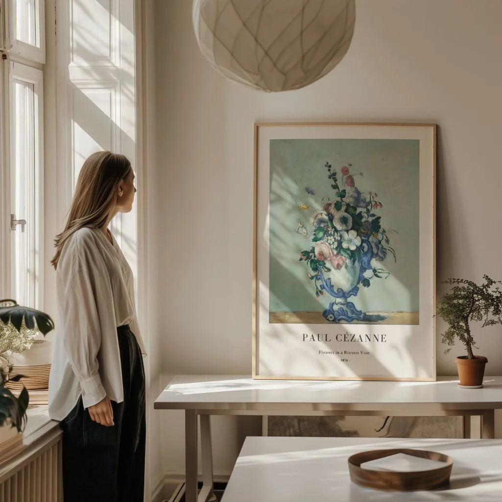 Paul Cézanne’s Flowers in a Rococo Vase blends classical grace with a modern, post-impressionist sense of color and light. A rich bouquet rises from an elegant rococo vase, set against gentle pastel blues and greens that create an airy, calming atmosphere. The composition feels refined yet fresh—perfect for adding quiet beauty to a living room, bedroom, or stylish office. This wall art suits classic, minimalist, and vintage interiors alike. Choose it as a framed poster or an unframed print to bring a subtle touch of French chic and museum-worthy charm into your space.