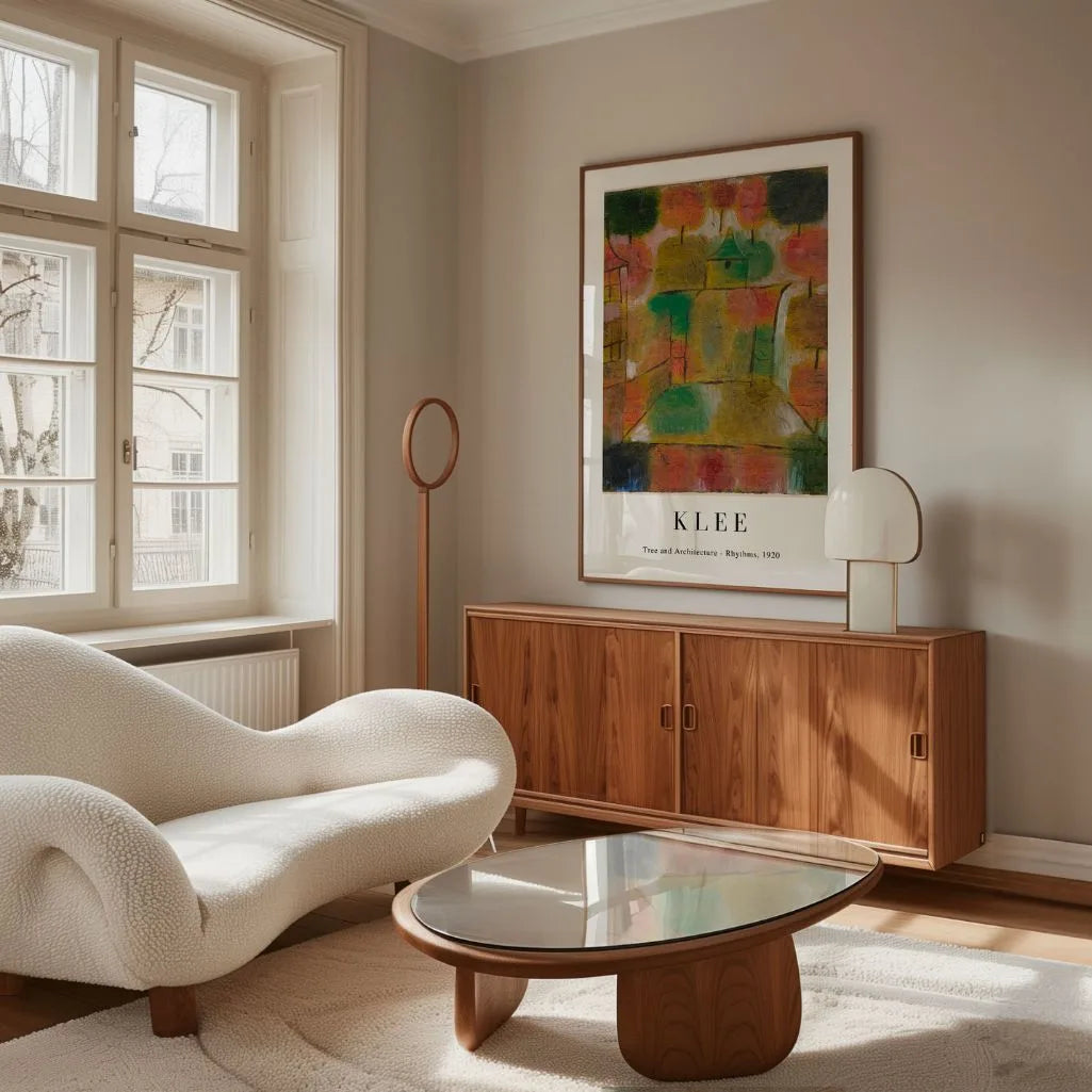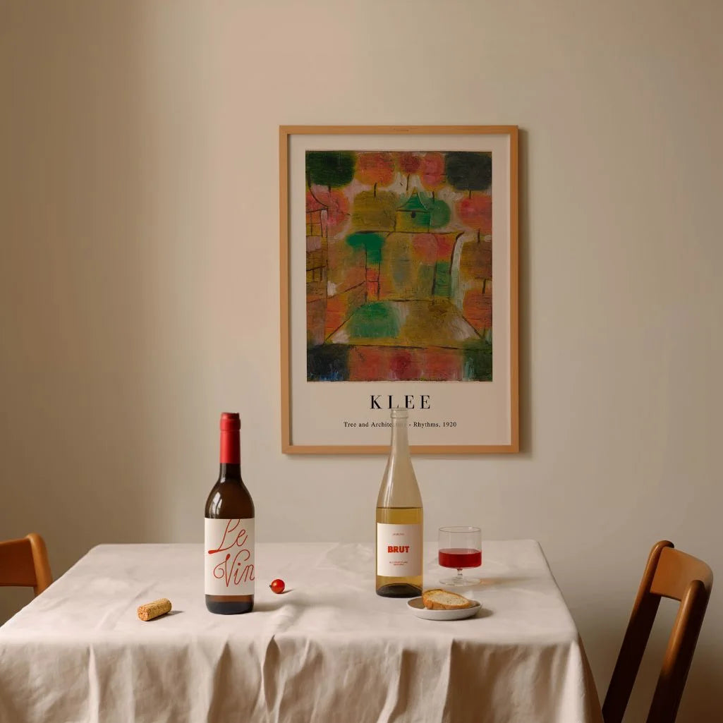 Paul Klee’s Tree and Architecture: Rhythms is a poetic meeting of the organic and the geometric—where the pulse of life appears in both nature and built form. Warm greens, reds, and ochres create a gentle balance between tree-like shapes and architectural blocks, giving the composition a calm, meditative presence. The result feels thoughtful yet inviting, adding artistic character without overwhelming the room. This wall art works beautifully in modern, minimalist, and creative interiors. Choose it as a framed poster or an unframed print to bring quiet rhythm, color harmony, and modern abstraction into your living room, office, or studio.