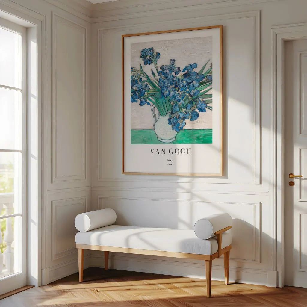 Bring calm, refined wall art into your space with this Vincent van Gogh Blue Irises in a Vase poster. Vivid blue irises arranged in a simple white jug stand out against a light background, creating a clean, harmonious composition with subtle post-impressionist energy.
