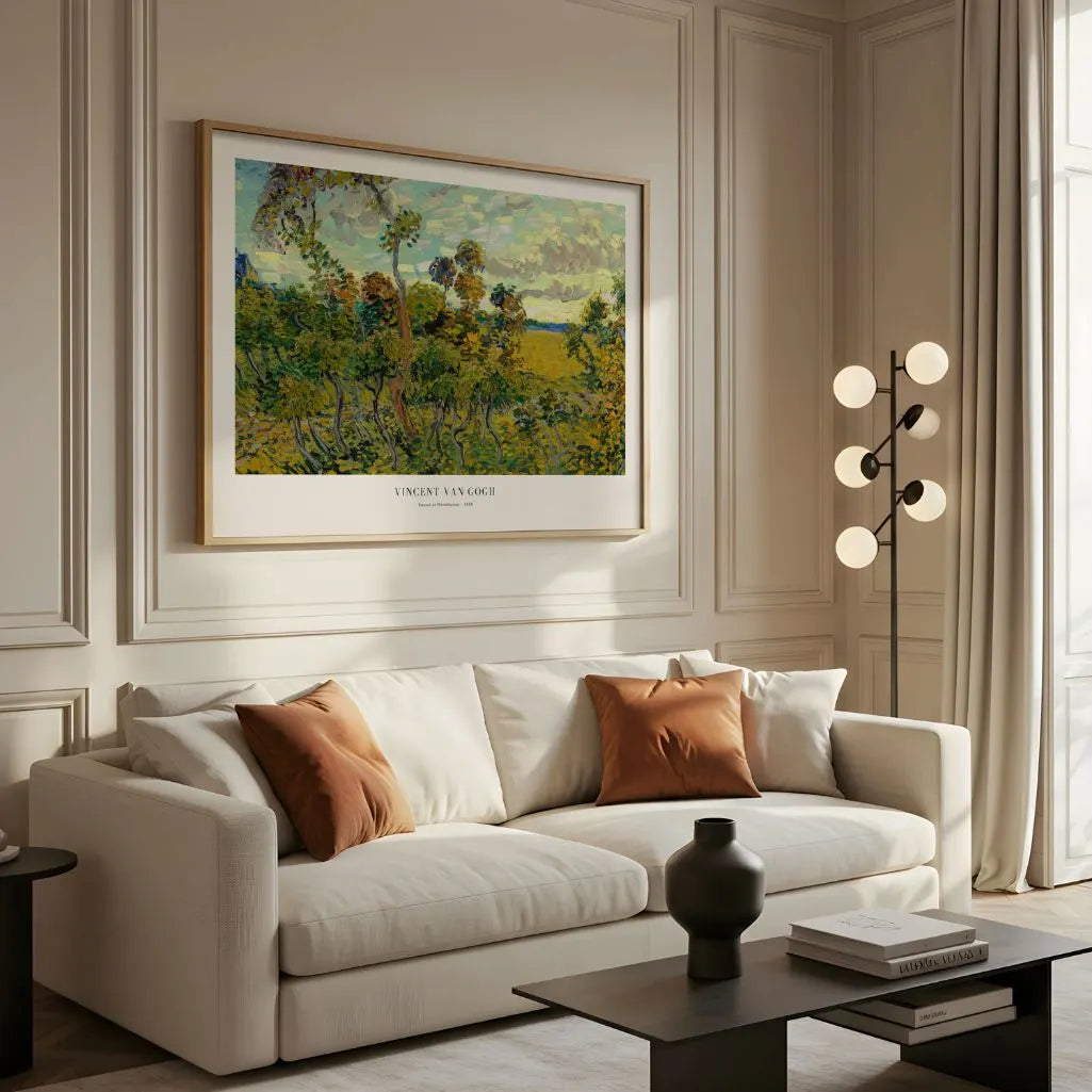 Bring radiant evening energy to your walls with this horizontal-format Vincent van Gogh Sunset at Montmajour poster. Painted near Arles, the scene captures fields and trees glowing before dusk, rendered with expressive brushwork and rich post-impressionist color.
